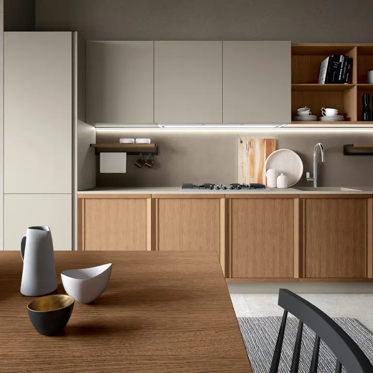Typically classical details, like shaker doors and large areas of glass, merge perfectly into a kitchen composition characterised by versatile lines that are ideal for both metropolitan and traditional contexts. The doors’ lightweight outer frame features inward-sloping elements that contrast with slender horizontal rails containing a practical handle.