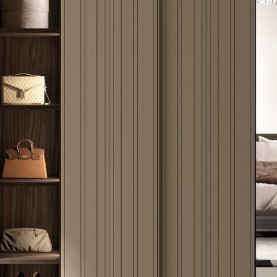 The door of the Tempo wardrobe has a symmetrical vertical line with a non-constant pitch and is made in a lacquered version with matching slats and wood veneer with black slats.